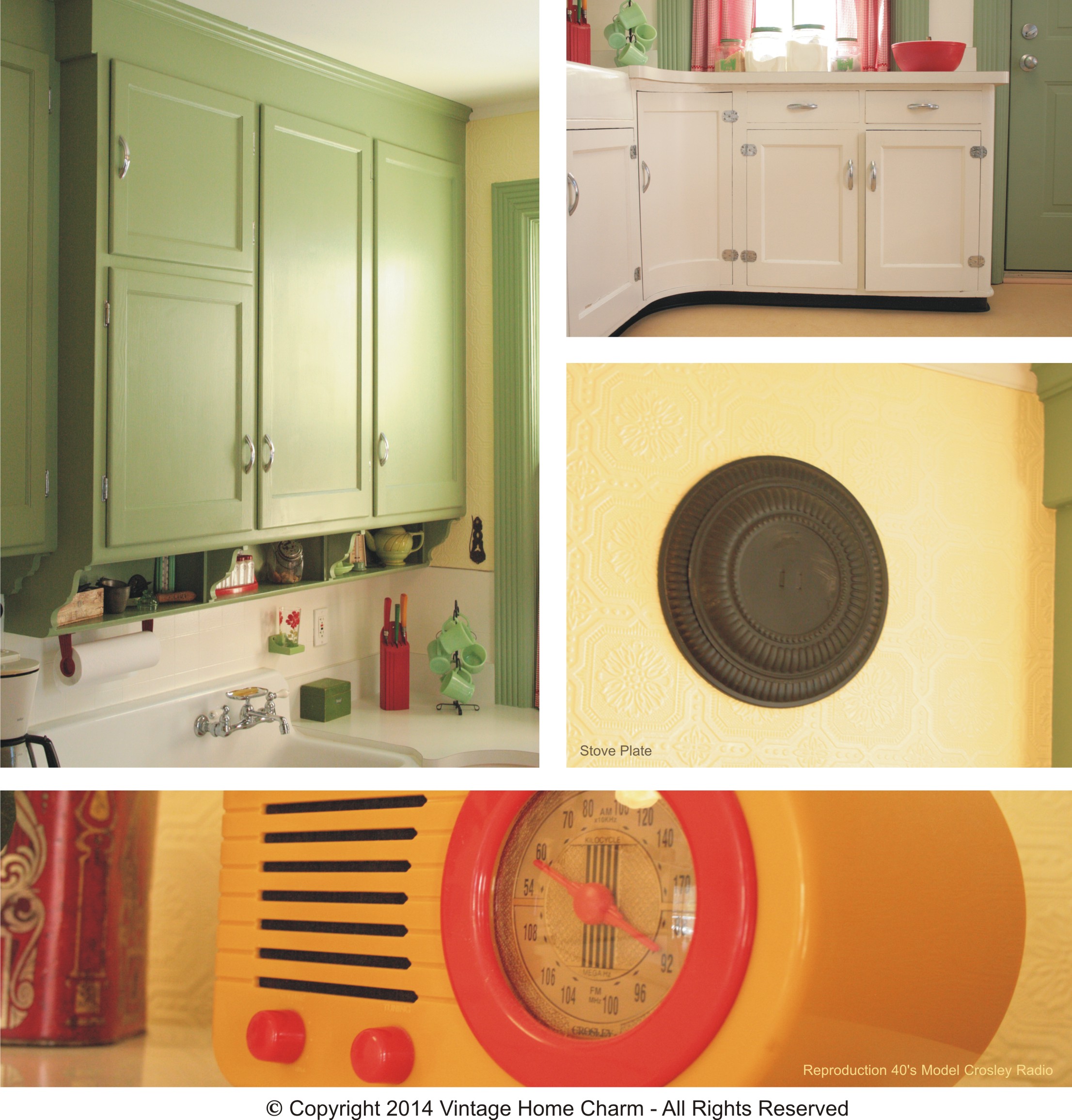Lori: With the exception of the radio (which is a reproduction 40’s model Crosley) all of the pieces are vintage and would have been found in a kitchen of that era. The clock is a china 8-day wind up made in Germany that still works well. Both Jadite and Bakelite were very popular in the 40’s. Bakelite-handled utensils were actually available in the late 1920’s and became very popular because of the colours they came in. They were a cheery refreshing change from the wooden or metal utensils that were being used at the time. You can find a wide variety of cutlery and utensils with Bakelite handles as well as napkin rings, cabinet handles etc. Most of the Jadite I have was made by Fire-King and would have been everyday kitchen wear. The canisters are also vintage glassware from the same era.