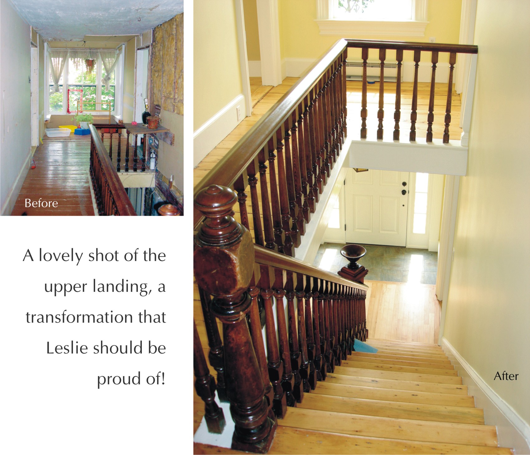 One of the biggest problems encountered during the renovations was determining what material was original and what dated from later renovations. Since much of the woodwork was gone, there was not much to provide clues. What bits of woodwork were still in the house, as well as various pieces found in an out-building, were replicated. While two of the upstairs mantles appear to be original, the fireplaces themselves had all been converted to burn coal (probably around the time the bays were added). Another issue was that when original material was in place, it had often suffered substantial water damage. For example, hours were spent cleaning, sanding and oiling the stair rails. Whenever possible, a serious attempt was made to salvage this damaged material.