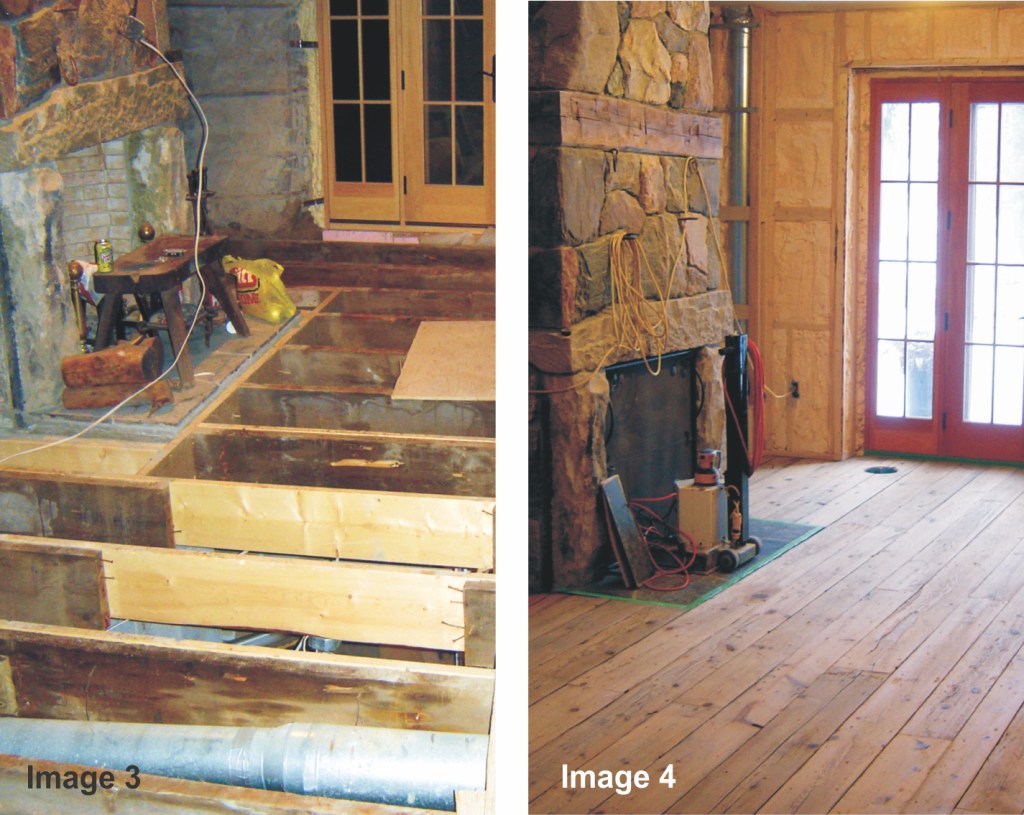 Structural issues (see Image 3) need to be remedied prior to laying a new floor. This project by Historic Lumber (see Image 4) was to lay a beautiful reclaimed tongue and groove pine floor, gently sand it and in Image 5, finish it to bring back its lustre and character. The floor looks like it has been in this remodelled kitchen for 100 years.