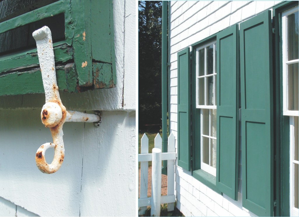 Hardware for shutters changed over the periods from the Port Royal settlement (see image A) to the Edwardian Period (1605 – 1911). Close attention should be paid to choose the right hardware: hinges, shutter dogs (used to keep shutters in their open position), and even the styles of hooks used to secure shutters in their closed position. Do your research with respect to hardware to find authentic hardware to match your architectural design era.