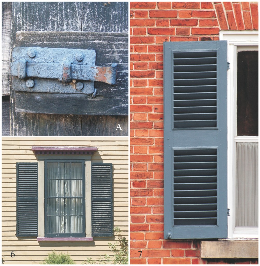 With respect to colour of shutters, the earlier Georgian and Neo-Classical homes often had very dark shutters: lamp black, chocolate, or very dark, almost black, green. During the Revival periods, a darker or lighter shade of the main body colour of the house was used. During the Queen Anne Revival period, shutter frames were often painted the house’s trim colour and the body colour was used for the raised panels or the louvers. Or, if you want to go with the standard colour used to the point of cliché, go with verdigris – hunter or forest green!