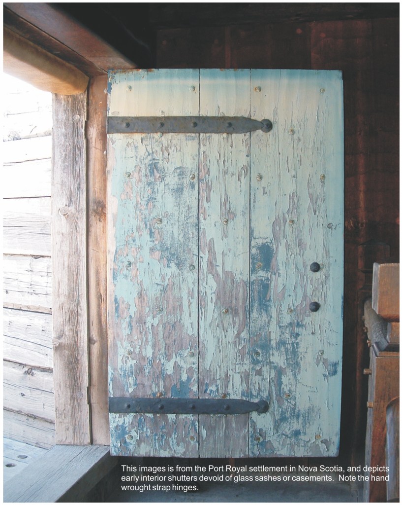 In the very early days of settlement in North America, carrying windowpanes over the wildly pitching sea in a leaky ship from the Mother Country was at best only for the wealthiest of individuals and not for the commoners. Shutters, or blinds, as they were originally named, were horizontal or vertical sliding affairs. They were usually solid and affixed to the interior of window openings (replacing glass-paned sashes) becoming both a way to allow light and fresh air into the homestead and also as a way to keep out the elements our climate would throw at our early settlers.
