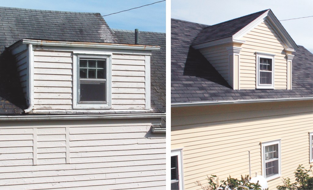 The house is on the Barrington Municipality’s Registered Heritage Property list, so after their approval, we set to work with our carpenter, Bill Ross of Port Saxon. He has worked on many of the old homes in the area and is known to be the best. He warned us that even he could not know how much rot there might be until he got into it. Most of the clapboard and trim had to be replaced with pine, being careful to copy the original. The entire foundation sill had to be replaced on the front of the house. The section to the left of the front door had extensive rot, from the clapboard, sheathing, and studs to the interior horizontal wooden dado. We love the photo showing our living room interior from the street (see top image)! We added pilasters to the smaller ell and dormers and we did things to ensure water flowed away from the house. The old flat-roofed dormer in the back was replaced with a high-pitched roof that sheds water away from the house. The original vestibule was long gone, but its reinforced roof hung on for seventy additional years. We had a new vestibule built under this roof, which kept the original form in proportion. It looks as though it was never absent. It was important to us to keep the original six-over-six windows, since, as Chris says, they are the most character defining elements in an old house. They do need some work now, so we’ll use the article, “Re-glazing Old Windows” in “Old Home Living” as our guide when we’re ready for that project.