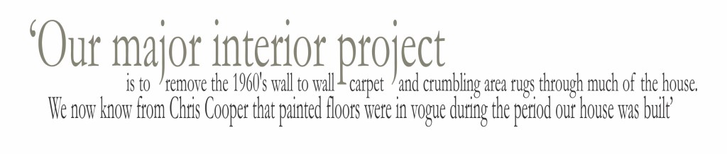 Our major interior project is to remove the 1960’s wall to wall carpet and crumbling area rugs through much of the house. We now know from Chris that painted floors were in vogue during the period our house was built, so we are trying to paint one room every year. We love the wide floor boards. Some are worn more than others and each board seems to have its own personality.
