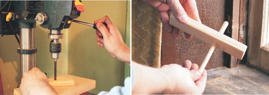 The slide is now marked (as above) at the farthest point to which it is fully engaged in the keeper or in the locked position. By measuring back half the thickness of the draw pin, I will have the exact position to drill a hole through the slide to house the draw pin (see image 15). The draw pin is a hand-shaped piece of pine (larger than the drilled hole) in which I have simply drove home with a wooden mallet through the slide allowing plenty of room on the inner door side when it is mounted to allow a good grasp (see image 16).