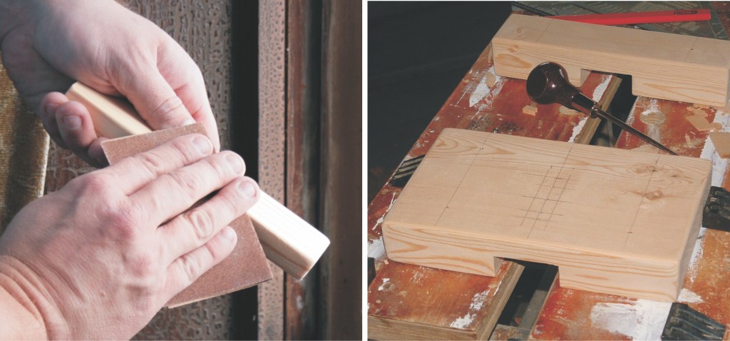 I fashioned the slide out of a good hard piece of very old pine, cutting it slightly smaller in dimension to the height and depth of the slot in the box and keeper. I rounded over all the edges a little with sandpaper to allow the slide free movement without bind (see image 8). With a sharp saw I then cut the slide to length and rounded the ends as well with sandpaper.