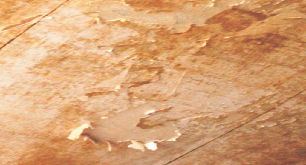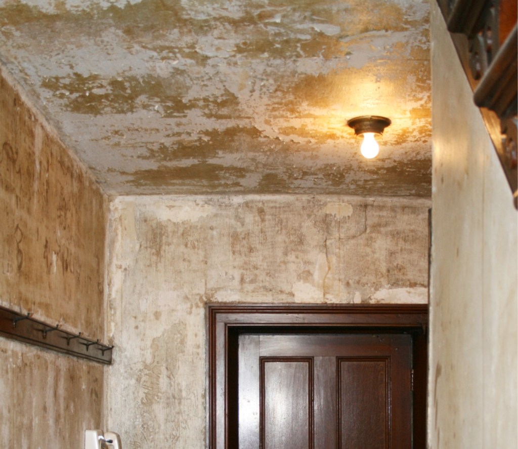At the Blenheim Farms House, eight rooms and both halls are papered. From the day the house was built, these papered walls have never been painted. On the second level where very old wallpaper resides, the removal process has been a breeze and the plaster below the paper needs only a modicum of repair. The main living level is an entirely different story; the walls have been decorated and redecorated continuously over the past 170 years. It seems the previous layers of paper have never been completely removed. The ceilings in the living level are, in the most miserable condition due in part to the calcimine (see side bar for more information) used as ceiling whitening (see image 1).
