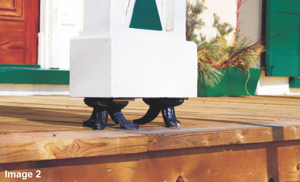 Small decorative metal risers are available to lift the post or column off the deck and to allow any water to run under and off the deck surface (see Image 2). Column risers should always be used, even if the deck is made of wood. Risers are available at building supply stores across Canada, and the more decorative original cast iron versions may be found at your local architectural salvage company.