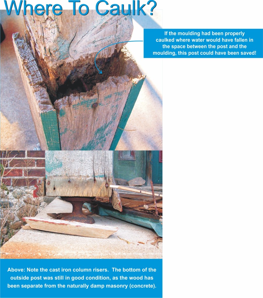 The demise and rot of most exterior millwork, including windows, is neglect! If you love character and do not believe there is such a thing as “maintenance free,” then you must keep an eye on your exterior wooden elements and tend to them as they require attention. Wooden elements will last indefinitely if you cheat rot with a good paint job, good caulking (see below) and good water management.