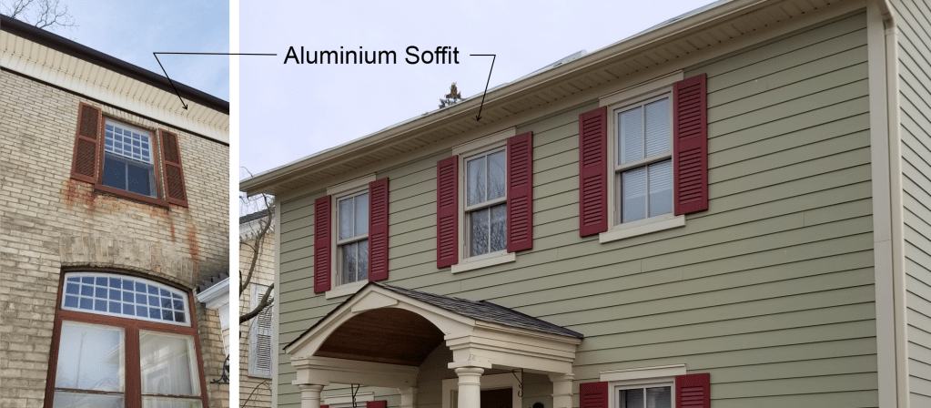 Find that house. Look at that house! Now, go find a similar building with similar beautiful roof brackets. But this time with a restored or maintained wood soffit above. Less clunky and awkward. You’ll see. But that is just the start. There is a good chance this second building will have a livelier paint job than the first. The beautiful brackets on the house with the aluminum (or vinyl) soffits were likely painted to blend with the pre-finished colour of bland found on that new character-phobic element. What the wood soffits provides is encouragement, an open mind to colour. A world of colour.
