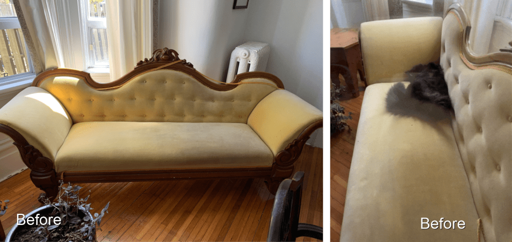 My client and I came across a couch while we were out shopping for treasures at an antique market. Despite it being in rough shape, it’s graceful curves, and the decorative scrolls accenting the wood frame drew us like a magnet. Claire wanted the couch to be a conversation piece, and she wasn’t afraid to be bold. With that in mind, I suggested we try something different, and presented her with a concept of upholstering it in several fabrics, instead of using just one. Claire was drawn to a particular fabric that had with a large floral pattern. We decided to use that on the backrest and chose fabrics which would compliment it. A diamond pattern in a smaller scale covered the seat, while the arms and back of the couch were balanced out with a solid coloured fabric. The same fabric that was used on the arms was used to cover the buttons for the tufting. The piece was then finished in a contrasting trim.